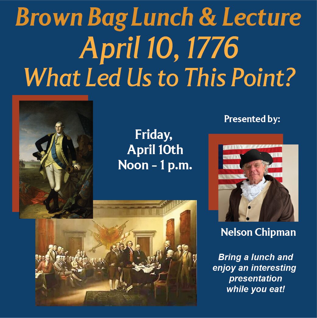 Join us the second in our America’s 250 Brown Bag Lunch & Lecture series featuring presentations on the Revolutionary War era. The Brown Bag event is on Friday, April 10, from Noon – 1:00 p.m. Join local attorney Nelson “Nathaniel” Chipman for an in-depth look at the events that shaped the American freedom struggle in the time preceding July 4, 1776.