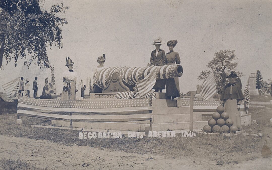 The June 13, 1902, the Enquirer stated: “The cannon presented by the government to the Bremen G.A.R. arrived yesterday morning. Last Friday Mrs. Dr. Smith and Mrs. Marquet circulated a subscription paper and in a short time secured $200 to be used in paying transportation charges and mounting the piece in the cemetery. It will be placed at left of the main driveway, just inside the gate, and mounted on a pyramid of limestone 40 inches high and with a base of 10-1/2 X 12-/2 feet. At each side of the gun will be a small pyramid of shells. The gun is 10-1/2 feet long, 8-inch caliber and weighs about 3 tons.”
