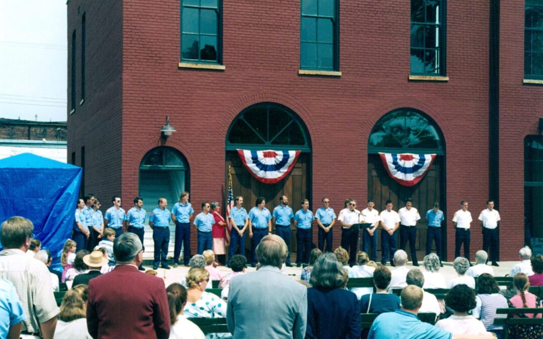 Feature Image. Fire House dedication, firemen standing in front of old firehouse, ca 1995.
