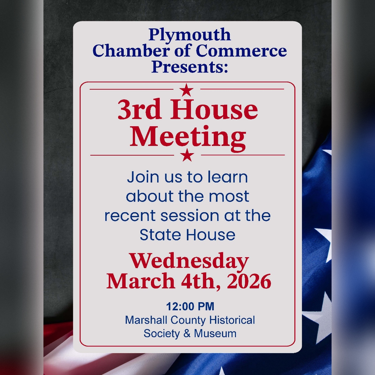 The Plymouth Chamber of Commerce presents 3rd House Meeting. This will include a panel of state legislators who will discuss the most recent session at the State House. Come ask […]