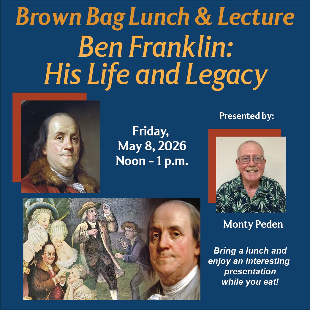 Benjamin Franklin -- printer, writer, publisher, scientist, inventor, philosopher, public servant, diplomat and a key Founding Father of our nation. Former Plymouth teacher and lifelong genealogist Monty Peden will share all about this true Renaissance man, with some little known facts and surprises along the way.