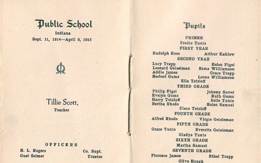 Born in a covered wagon in What Cheer, Iowa in 1898, Tillie Scott’s educational prospects were initially dim but improved when her parents returned home to their farming community in Pulaski County, Indiana. One room schoolhouses sprouted up every couple of miles alongside the cornfields that covered the county. For seven or so years between September and April, whether it was sunny, rainy or snowing, Tillie tramped down the dirt road from her family’s farm to the nearest school. By age thirteen or fourteen, she finished the sixth grade, the highest grade completed by each of her parents.