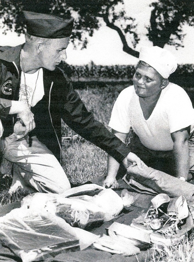 A 14-year-old Steve Gonce receives packing advice from Explorer advisor Bruce VanDerWeele before their 1954 wilderness trip.
